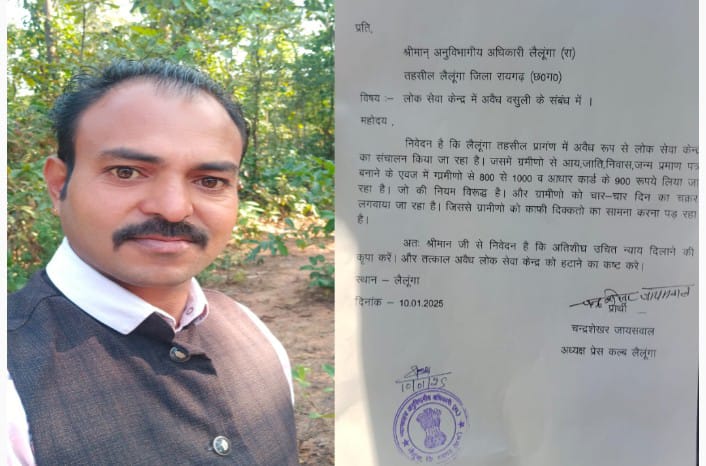 लोक सेवा केंद्र संचालक का आतंक, अनुविभागीय अधिकारी से की गई शिकायत |लैलूंगा :- रायगढ़ जिले के लैलूंगा विकासखंड अन्तर्गत...