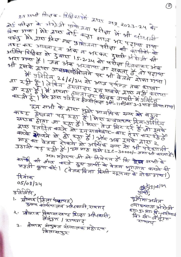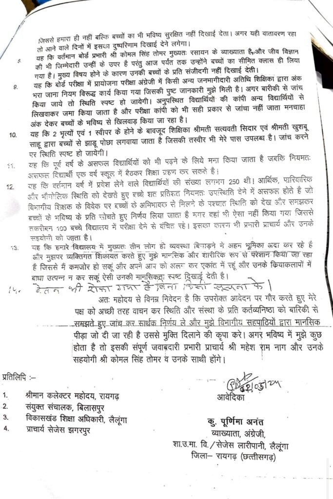 स्कूल के प्रभारी प्राचार्य अन्य स्टाफ के साथ तोमर सर की उनके प्रति व्यवहार ने उनको बहुत ही दुखी कर दिया है जिससे उनका स्वास्थ्य दिन प्रतिदिन मानसिक रूप से चिंतित है और विगत 9 माह से पूरा प्रयास किया जा रहा है वेतन रोकवाने का । ग्रीष्मकालीन अवकाश में भी अनुपस्थित किया गया जबकि उनके द्वारा निर्वाचन कार्य किया गया । विद्यार्थियों और अन्य स्टाफ को भी आने और बात करने से सबके द्वारा मना किया भी जाता है। तो मना किया जाता है तो पढ़ना पढ़ाना संभव कैसे होगा। तंग करने वाले कर्मचारी का नाम- बिंदु एक्का, कोमलसिंह तोमर,महेश राम नाग,सत्यवती सिदार,सहदेव साय,मंजू साहू ,वर्षा कौशिक,सुभाष चंद्र bhoy,