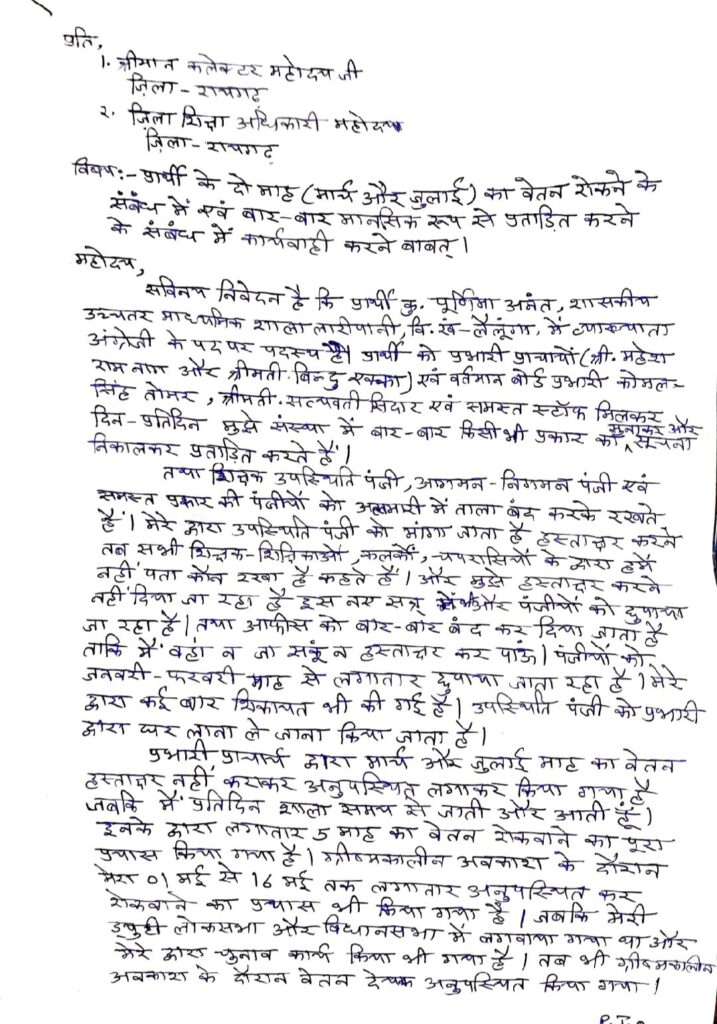 रायगढ़ :-वैसे तो शिक्षा की मंदिर बच्चों को उचित शिक्षा देना और उन्हें नए रास्ते दिखाकर राष्ट्र का निर्माण करना इत्यादि है लेकिन जिस स्कूल में बच्चों को शिक्षा देने वाले महिला शिक्षिका ही स्कूल के प्राचार्य और स्टाफ से प्रताड़ित हो उस स्कूल की बच्चों को उचित शिक्षा मिलने की कल्पना करना ही मूर्खता होगी ऐसे ही एक शिक्षक एक स्कूल है रायगढ़ जिले के लैलूंगा विकासखंड में जिसे पूर्ववर्ती सरकार ने बच्चों की अच्छा शिक्षा देने के उद्देश्य से स्वामी आत्मानंद के नाम से उन्नयन किया गया है बात हो रही है शासकीय उच्चतर माध्यमिक विद्यालय लारी पानी जहां पर पूर्व प्रभारी प्राचार्य श्री महेश राम नाग और वर्तमान प्रभारी प्राचार्य श्रीमती बिंदु एक्का एवं वर्तमान बोर्ड प्रभारी श्री कोमल सिंह तोमर के द्वारा संस्था में पदस्थ कुमारी पूर्णिमा अनंत जो व्याख्याता है अंग्रेजी विषय के शिक्षिका है और अनुसूचित जाति से है उक्त महिला शिक्षिका को प्रभारी प्राचार्य वा संस्था में पदस्थ अन्य स्टाफ सामान्य व्यवहार नहीं करते महिला शिक्षिका प्रतिदिन स्कूल शासन के निर्धारित समय पर पहुंच जाती है पर प्रभारी प्राचार्य के द्वारा उसे प्रताड़ित करने के उद्देश्य से शिक्षक उपस्थिति पंजी को या तो लाकर में बंद कर देती है या अपने साथ अपने निवास स्थान लेकर चली जाती है उनके द्वारा उपस्थिति पंजी की मांग करने पर प्राचार्य के द्वारा अन्य स्टाफ को मना किया जाता है सभी हमें नही पता कहते है। अपने पास नहीं होने की बात कहती हैं स्टाफ के अन्य साथियों से भी बात करने पर पंजी की जानकारी नहीं होना बताया जाता है जिस कारण से उपस्थिति स्कूलों में प्रमाणित नहीं हो पाती है वह प्रतिदिन बच्चों को अध्यापन कराती है डायरी मेंटेन करती है और निर्धारित समय तक स्कूल में रहकर अपनी कर्तव्यों का निर्वहन करती है जिसका प्रमाण संस्था के पढ़ाए गए बच्चे दे देंगे उसके बावजूद भी प्रभारी प्राचार्य वा अन्य स्टाफ के द्वारा क्यों इनके साथ भेदभाव करते हैं समझ से परे हैं वह स्कूल में अनुसूचित जाति महिला कर्मी के रूप में अकेली है क्या उनके साथ जातिगत दुर्भावना बस ऐसा किया जाता है या बात कुछऔर है या किसी के कहने से ऐसा किया जाता है प्रभारी प्राचार्य के द्वारा स्कूल फीस के नाम पर ,स्थानारण प्रमाण पत्र जारी करने के नाम पर,इंस्पायर अवार्ड के नाम पर पैसा लेना बच्चो का शोषण करना आम बात हो गई प्रभारी प्राचार्य के द्वारा अपने चहेते शिक्षक शिक्षिकाओं को मनचाहा छुट्टी देना पढ़ाई करने न करने पर भी कुछ नही कहना जैसे बातो को महिला शिक्षिका द्वारा विरोध करने पर देख लेने को धमकी दिया जाता है जबकि पीड़िता शिक्षिका का आवेदन देने पर भी पंजी में एंट्री ना करके अफसेंट लिखन