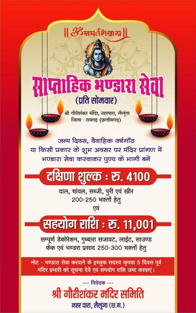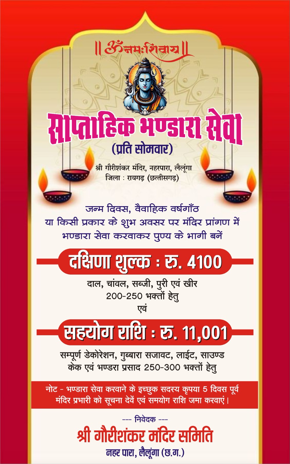 गौरी शंकर मंदिर प्रांगण में भंडारा करवाने के इच्छुक भक्तों के लिए एक विशेष सुविधा उपलब्ध है। जन्मदिन, वैवाहिक वर्षगांठ आदि शुभ अवसरों पर संपूर्ण सजावट के साथ आप भंडारा करवा सकते हैं। यह सुविधा रायगढ़ जिला के प्रसिद्ध धर्म रक्षक आचार्य पंडित परमानंद शास्त्री जी के मार्गदर्शन में प्रदान की जा रही है।