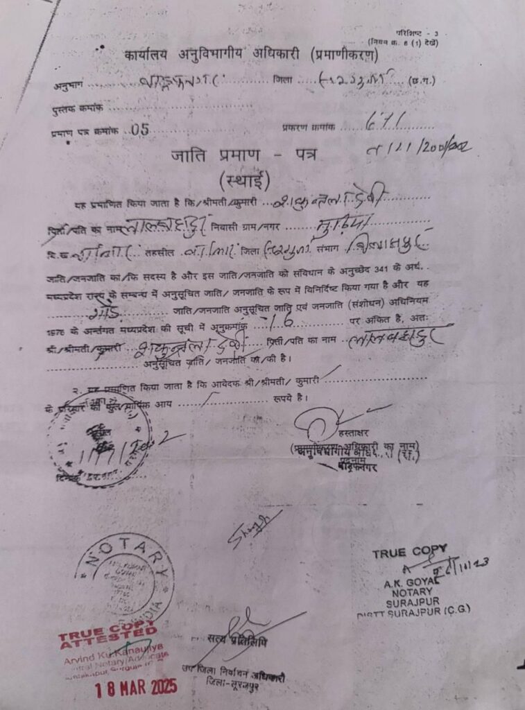 आरोप बेहद गंभीर — फर्जी जाति प्रमाण पत्र।