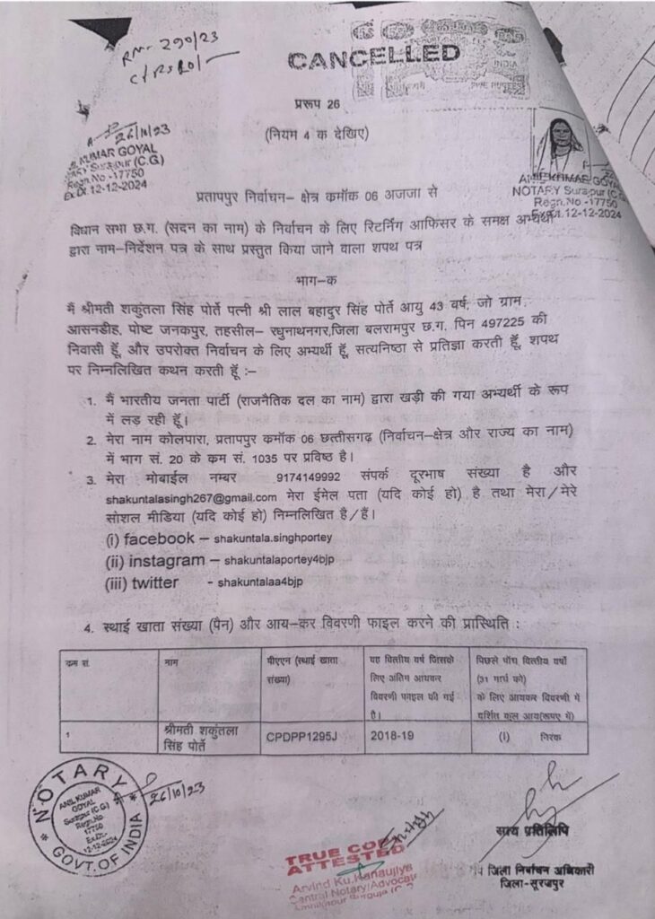 प्रतापपुर विधानसभा की भाजपा विधायक शकुंतला सिंह पोर्ते एक बार फिर विवादों के केंद्र में हैं। इस बार मामला बेहद गंभीर है — फर्जी जाति प्रमाण पत्र का आरोप, और यह आरोप लगाया है प्रदेश के वरिष्ठ आदिवासी नेता एवं पूर्व शिक्षा मंत्री डॉ. प्रेमसाय सिंह टेकाम ने।