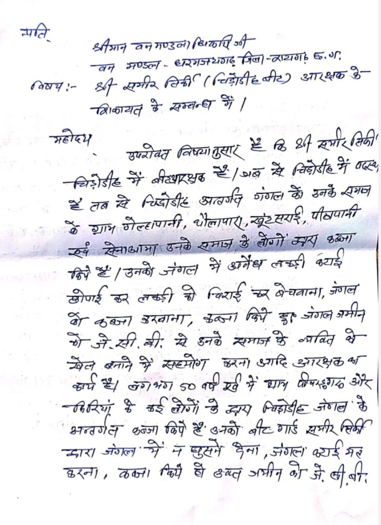 बता दें,ग्रामीणों ने अपने पत्र में स्पष्ट आरोप लगाया है कि बाकारुमा वनपरिक्षेत्र में पदस्थ बीट गार्ड समीर तिर्की के संरक्षण में जंगलों पर अवैध कब्जा, लकड़ी की कटाई, चिराई और खुलेआम बिक्री का गोरखधंधा चल रहा है। शिकायत कागज में उल्लेख किया गया है कि चिरोडीह बीट अंतर्गत आने वाले जंगलों पर गेल्हापानी, थोलापारा, खूटसराई, पीठापानी एवं सेनाआमा ग्राम के एक विशेष समाज के लोगों द्वारा योजनाबद्ध तरीके से कब्जा कराया गया है। और वहीं ग्रामीणों का आरोप है कि बीते कुछ वर्षों में न केवल हरे-भरे जंगल काटे गए, बल्कि कब्जाई गई वनभूमि पर जेसीबी मशीन लगवाकर खेती योग्य जमीन तैयार कराई गई—वह भी कथित तौर पर बीट गार्ड की जानकारी और संरक्षण में।