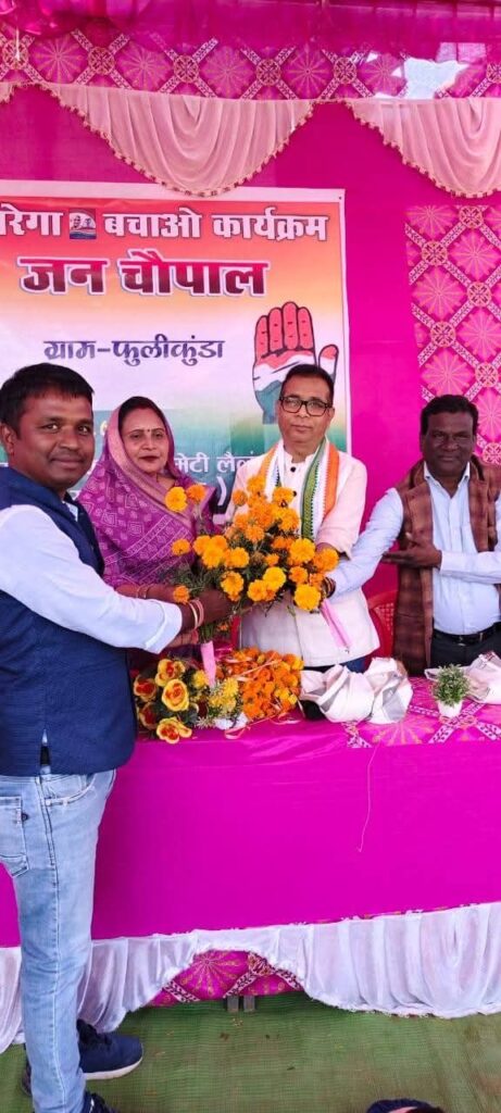 जन चौपाल में केंद्र सरकार द्वारा महात्मा गांधी राष्ट्रीय ग्रामीण रोजगार गारंटी योजना (मनरेगा) को धीरे-धीरे समाप्त कर उसके स्थान पर नई योजना लाने के प्रयासों का जोरदार विरोध किया गया। कांग्रेस नेताओं ने इसे ग्रामीण भारत से काम का अधिकार, रोजगार का अधिकार और सम्मानपूर्वक जीवन का अधिकार छीनने की साजिश करार दिया। कार्यक्रम में उपस्थित वक्ताओं ने कहा कि मनरेगा केवल एक योजना नहीं, बल्कि देश के करोड़ों ग्रामीण मजदूरों के लिए जीवनरेखा है। इसके माध्यम से ग्रामीणों को वर्ष में 100 दिन का सुनिश्चित रोजगार मिलता है, जिससे गांवों से शहरों की ओर पलायन रुकता है,गरीब परिवारों की आर्थिक सुरक्षा बनी रहती है,महिलाओं को रोजगार और आत्मनिर्भरता मिलती है, ग्रामीण अर्थव्यवस्था मजबूत होती है। मनरेगा के बंद होने से सबसे अधिक असर गरीब, मजदूर, किसान, महिलाएं और आदिवासी समाज पर पड़ेगा। इससे बेरोजगारी बढ़ेगी, भूख और गरीबी गहराएगी तथा ग्रामीण क्षेत्रों में सामाजिक असमानता और पलायन भयावह रूप लेगा। जन चौपाल से पूर्व ग्राम फूलीकुंडा में लैलूंगा विधायक श्रीमती विद्यावती सिदार के साथ नवनियुक्त जिला कांग्रेस कमेटी ग्रामीण रायगढ़ अध्यक्ष नगेंद्र नेगी एवं जिला कांग्रेस कमेटी शहर अध्यक्ष शाखा यादव का स्थानीय कांग्रेस कार्यकर्ताओं द्वारा भव्य एवं जोशीला स्वागत किया गया। कार्यक्रम के दौरान नवनियुक्त लैलूंगा मंडल के समस्त अध्यक्षों का सम्मान एवं अभिनंदन भी किया गया।