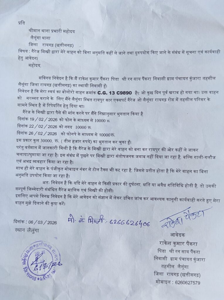 प्राप्त जानकारी के अनुसार ग्राम पंचायत कुंजारा निवासी राकेश कुमार पैंकरा ने अपने बोलेरो वाहन क्रमांक CG 13 C 9890 को खराब होने के कारण लैलूंगा स्थित रायपुर कार एक्सपर्ट गैरेज में मरम्मत के लिए दिया था। यह गैरेज लैलूंगा-रायगढ़ मुख्य मार्ग पर तहसील परिसर के सामने स्थित है। वाहन मालिक का आरोप है कि गैरेज मिस्त्री द्वारा बार-बार पैसे की मांग की गई, जिस पर उन्होंने अलग-अलग तिथियों में कुल 30 हजार रुपये का भुगतान किया।