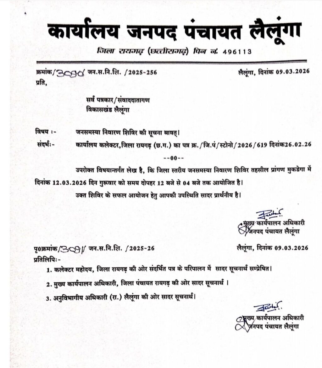 जनपद पंचायत लैलूंगा के मुख्य कार्यपालन अधिकारी ने सभी संबंधित अधिकारियों, जनप्रतिनिधियों और आम नागरिकों से शिविर में उपस्थित होकर कार्यक्रम को सफल बनाने की अपील की है। प्रशासन का उद्देश्य है कि लोगों को छोटे-छोटे कार्यों के लिए बार-बार दफ्तरों के चक्कर न लगाने पड़ें और उनकी समस्याओं का समाधान एक ही जगह पर हो सके।