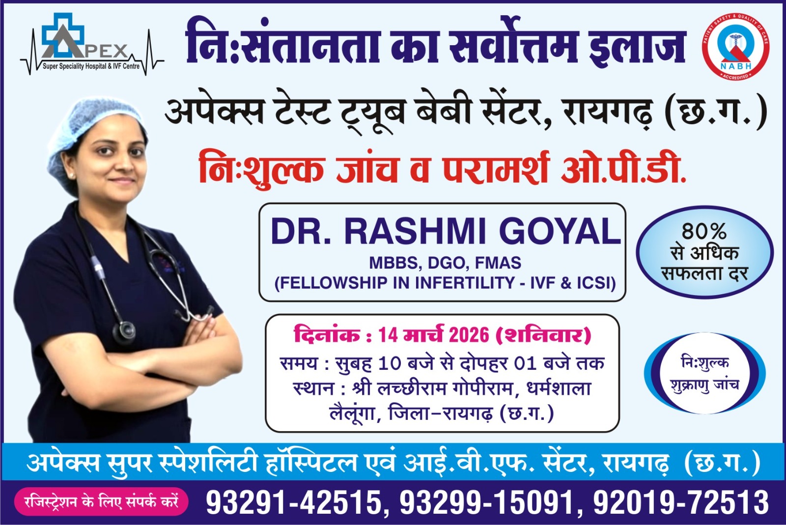 अपेक्स सुपरस्पेशलिटी हॉस्पिटल एवम् आईवीएफ सेंटर रायगढ़ द्वारा आयोजित, निःसंतान दंपतियों के लिए निःशुल्क जांच एवम् परामर्श ओपीडी का आयोजन दिनांक 14 मार्च 2026, दिन शनिवार को श्री लच्छीराम गोपीराम धर्मशाला लैलूंगा, जिला- रायगढ़ (छ.ग.)मे किया जा रहा है जिसमे इनफर्टिलिटी विशेषज्ञ डॉ रश्मि गोयल निःशुल्क जांच एवम् परमर्श हेतु उपलब्ध रहेंगी।