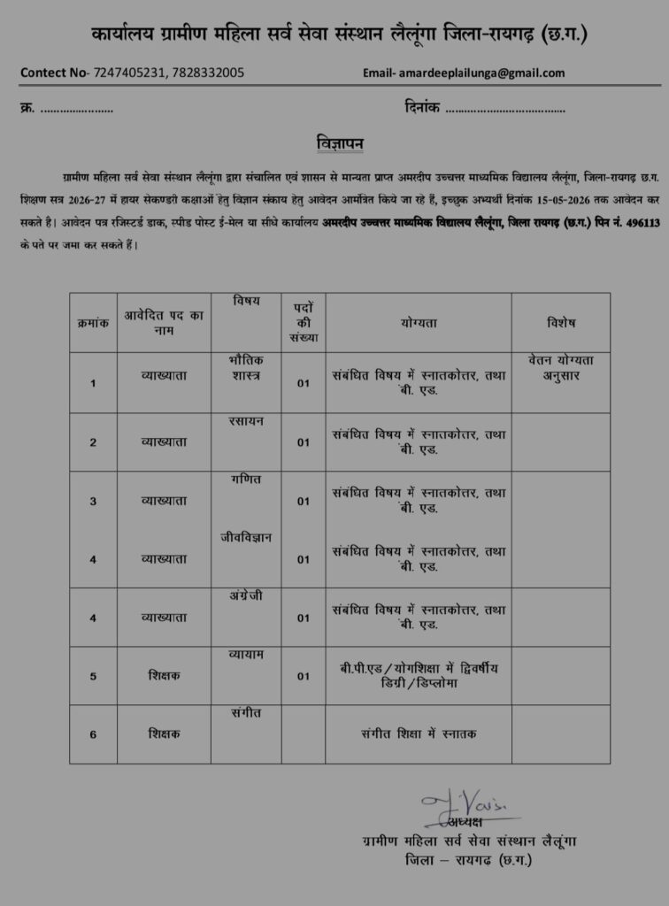 लैलूंगा, रायगढ़। ग्रामीण महिला सर्व सेवा संस्थान लैलूंगा द्वारा संचालित अमरदीप उच्चतर माध्यमिक विद्यालय लैलूंगा में शिक्षण सत्र 2026-27 के लिए हायर सेकंडरी कक्षाओं में विज्ञान संकाय के लिए आवेदन आमंत्रित किए जा रहे हैं।